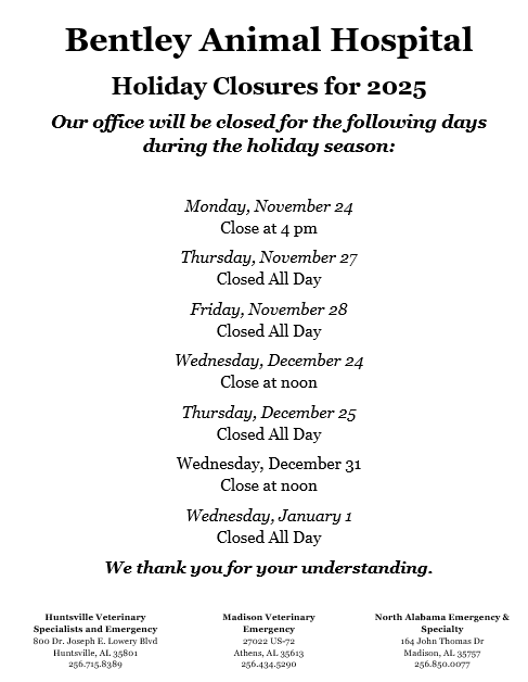 Bentley Animal Hospital is proud to serve Huntsville, AL and surrounding areas. We are dedicated to providing the highest level of veterinary medicine along with friendly, compassionate service.